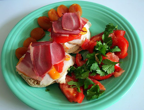 On Sunday (3/18), I was still at my parents' house, and I knew I was going to be grazing on leftovers all day. I started off with tortilla chips with salsa and guacamole and a big slice of chocolate cake. We made corned beef hash, and then after that I made a plate of nachos with some of the leftovers from the cheese platter. I ate handfuls of M&M's, a handful of full-fat Ruffles chips (wow), and even some bologna my brother had sitting in the fridge. My parents urged me to take the chocolate cake home with me because they are all on diets, and I knew that in doing so, I'd be hurling myself off mine for as long the cake lasted.